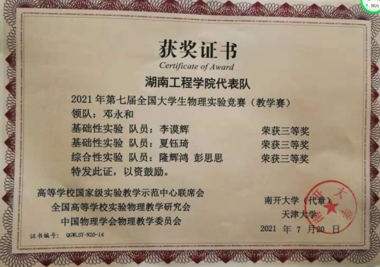 7月18-20日,大赛在南开大学和天津大学进行,共112所学校参赛,其中,湖南省只有国防科技大学、中南大学和kaiyun·云开官网三所学校参赛。kaiyun官网由于在第六届全国大学生物理实验竞赛(创新赛)中获得一等奖而受邀参赛。