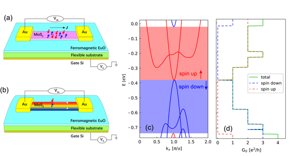 图2(a) 和 (b)展示了压电自旋晶体管示意图。其中,(a) 中未施加应变,(b)中施加拉伸应变。在拉伸应变作用下,自旋极化电子沿边界穿过MoS2纳米带,从而提供栅极电压调节费米能级。(b) 中渐变颜色标记了MoS2纳米带中压电电势分布。(c)和 (d)分别表示在6.9%拉力和2.4λM非局域交换场的共同作用下,21-ZMDSN的能带图和自旋电导图。其中,(c)中自旋向上和自旋向下区域分别用红色和蓝色标记。