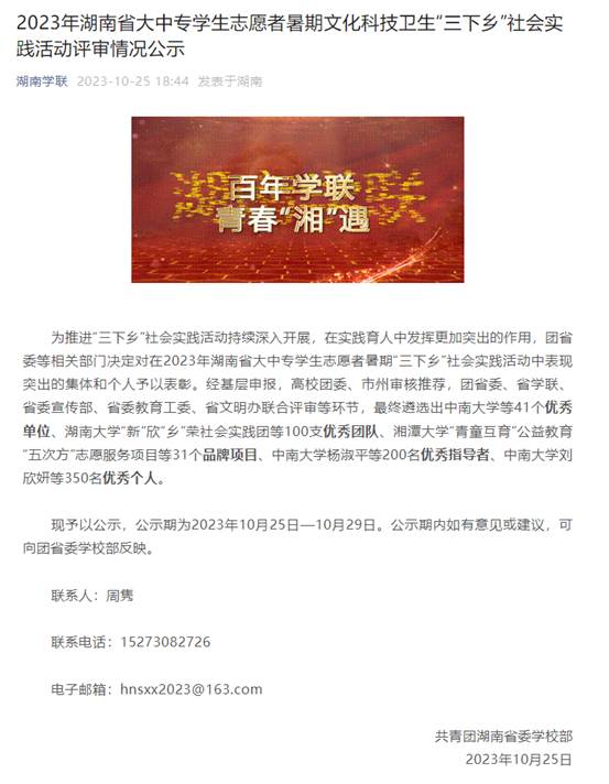 近日,共青团湖南省委学校部公布了2023年湖南省大中专学生志愿者暑期文化科技卫生“三下乡”社会实践活动评审结果,kaiyun·云开官网kaiyun·云开官网 “学习二十大 永远跟党走 奋进新征程”主题学习教育社会实践团获评优秀团队,团队成员统计学专业2101班龚艳星荣获评优秀个人。